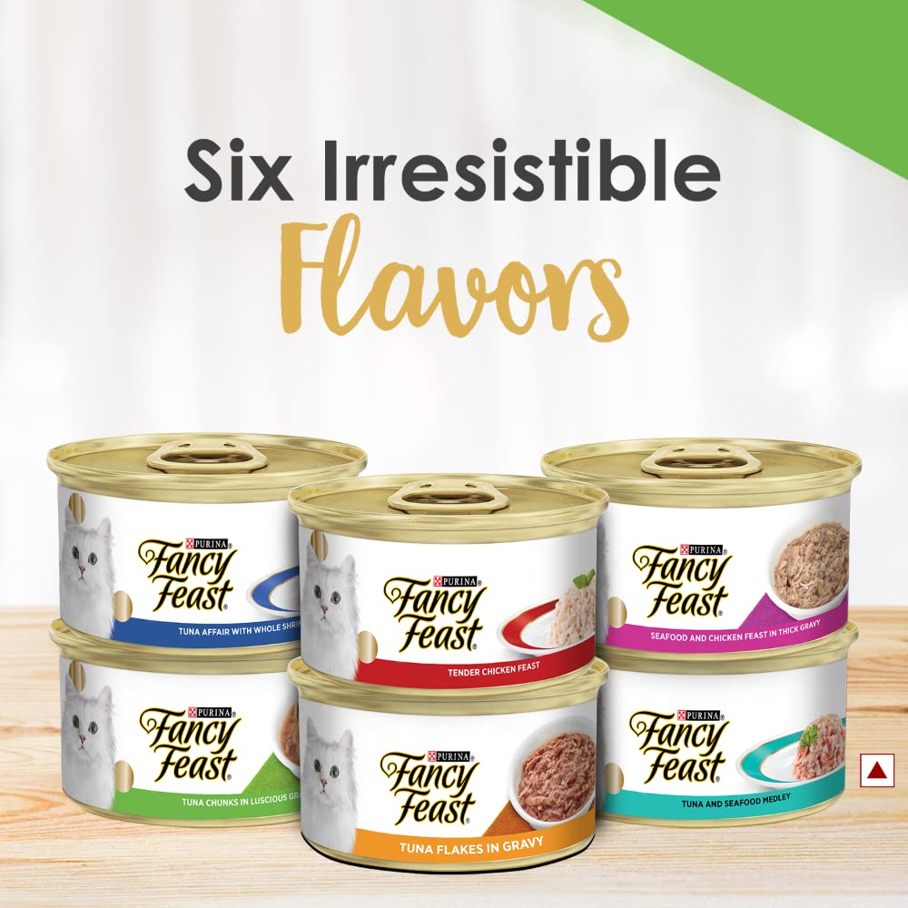 No one loves your cat like you do ƒ?? and no one loves helping you find ways to delight your cat like FANCY FEAST. FANCY FEAST has been setting the standard in gourmet cat food since 1982, creating and crafting unique taste experiences time and again. Delicious tastes. Irresistible textures. Thoughtful details. Each FANCY FEAST recipe has been carefully crafted using high quality ingredients because your cat deserves nothing but the best. Your cat will taste the love with every delicious bite, and you will feel good about what you put in her dish. Seafood & Chicken Feast provides a delectable meal with both of your cat's favorite meats dipped in a rich, delicious gravy. Available in a compact 85g can which ensures the meal stays fresh when you consume.