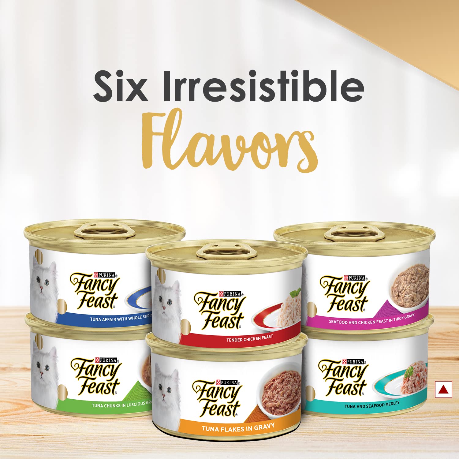 No one loves your cat like you do ƒ?? and no one loves helping you find ways to delight your cat like FANCY FEAST. FANCY FEAST has been setting the standard in gourmet cat food since 1982, creating and crafting unique taste experiences time and again. Delicious tastes. Irresistible textures. Thoughtful details. Each FANCY FEAST recipe has been carefully crafted using high quality ingredients because your cat deserves nothing but the best. Your cat will taste the love with every delicious bite, and you will feel good about what you put in her dish. Seafood & Chicken Feast provides a delectable meal with both of your cat's favorite meats dipped in a rich, delicious gravy. Available in a compact 85g can which ensures the meal stays fresh when you consume.