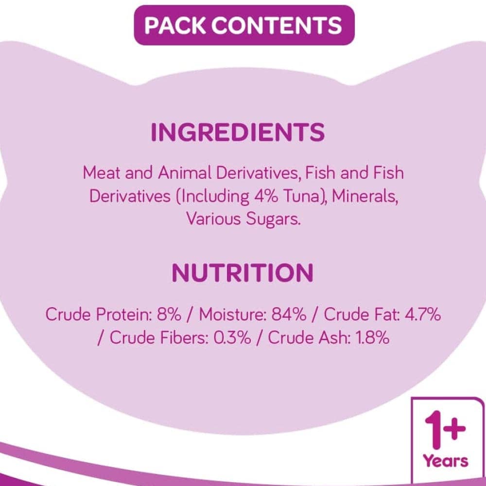 Whiskas Tuna in Jelly adult cat food is designed to take care of your catƒ??s daily nutritional requirements and provide it with all the protein, vitamins and minerals it needs for a healthy and happy life.