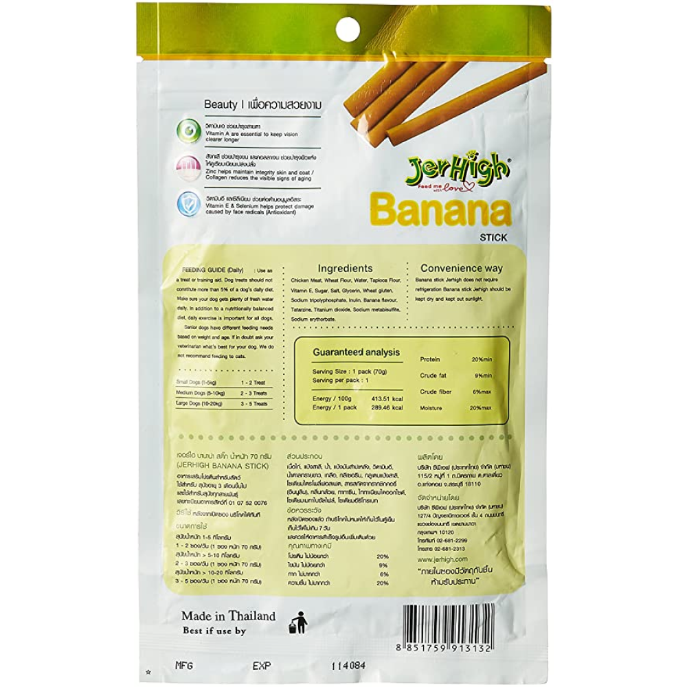 Your dog will fall in love with the taste of the JerHigh Banana Stick. Give your dog the best nutrition with these delectable snacks which are suitable for all dog breeds over the age of two months. JerHigh Banana Stick is a tasty treat packed with the nutritional goodness of essential vitamins and minerals and made with good quality protein-rich chicken. JerHigh Banana Stick Dog Treat is meticulously prepared to provide a pure, tasty and easily digestible snack filled with nutritional benefits for your dogƒ??s health. Bananas are enriched with Vitamin A to support healthy vision, zinc to help in maintaining skin and coat, collagen to help reduce signs of ageing, Vitamin E, selenium and antioxidants which helps maintaining damage caused by face radicals and promotes healthy muscle growth. These dog treats are made from fresh meat and are high in protein to ensure a healthier and shinier coat. JerHigh Dog Treats are an excellent way to keep your canine companion healthy and playful. Continue to reward your pet during training to help reinforce good behaviour. JerHigh Banana Stick is made with balanced nutrients and provides a variety of health benefits for your pet's well-being. These treats are in the shape of sticks, making them simple to feed and carry while still being easy and enjoyable for your dog to eat. It is ideal for feeding as a snack, rewarding good behaviour, and showing your pet love with some indulgent pampering!