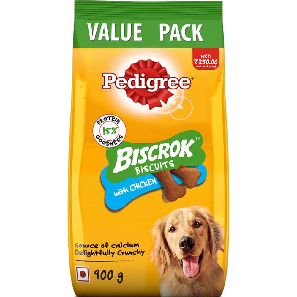 Pedigree Biscrok Biscuits are delightfully crunchy and nutritious biscuits that are perfect for daily training sessions or simply as a small snack between meals. Pedigree Biscuits are made to taste delicious, while it’s also nutritious with added essential vitamins and minerals. These tasty bone-shaped dog treats come filled with goodness of protein as well as a source of calcium. Each portion of the treat helps meet 10% of your pet’s daily energy requirement. Biscrok is recommended for all dog breeds & life stages over 4 months of age. Available in 2 delicious variants – treat your pet with tasty chicken or healthy milk biscuits every day. These biscuits for dogs contain no added artificial flavours.