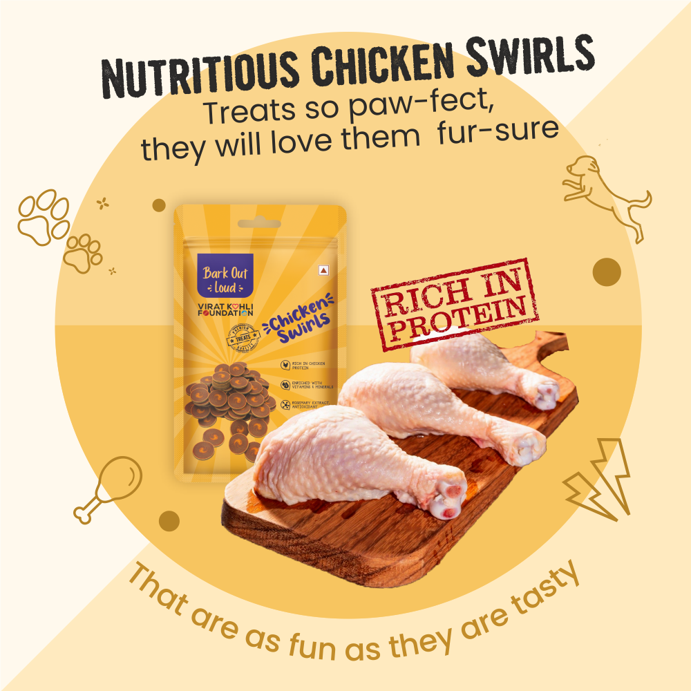 QUALITY PROTEIN ƒ?? Chicken Swirls from Bark out Loud by Vivaldis are guilt free treats made with only one protein source which is chicken, placing you in charge of what your dog is exposed to. Thoughtfully made, these treats would make your pets swirl in happiness!