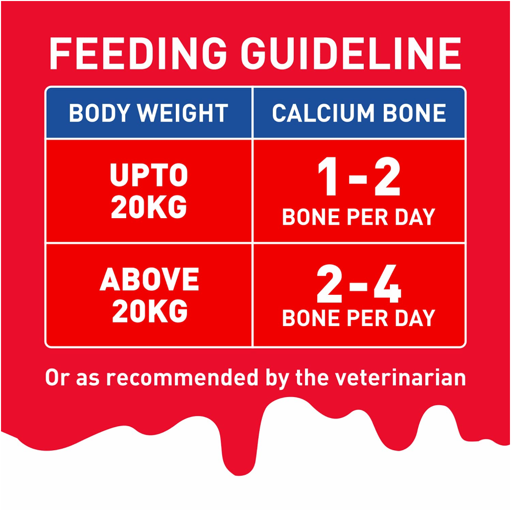 Feeding Recommendation - Upto 20kg Body Weight - 1 to 2 Bones per day; More than 20kg Body Weight - 2 to 4 Bones per day or as recommended by Veterinarian