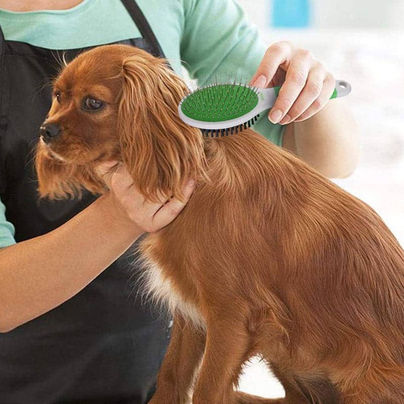2 in 1 brush with Stainless steel Pin in one Side and Bristles on the other sideside : One side of the brush features small metal pins that glide through your pets hair, removing tangles & knots along the way. The other side of the grooming brush showcases pliable bristles that are soft & gentle. They do not scratch or irritate your pet's sensitive skin. Instead, they smooth & slick to enhance shine