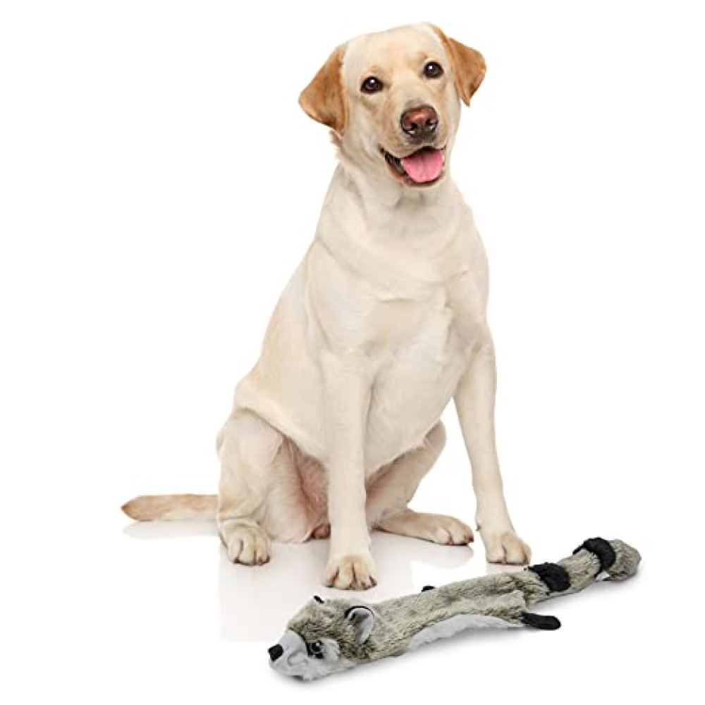 Fofos dog toy skinneez raccoon is a durable and interactive stuffing-less long dog toy. Stuffing- less toys ensure less destruction and also prevents your dog to chew through the inside of the toy. This toy is perfect for a fun game of tug of war. It is made from super-soft polyester fabric This tug toy has two squeakers inside- at the head and the tail and can easily get your dogs attention through the squeaky noise generated. Engaging toys such as this allow your dog to chew, fetch tug, and bite on it while getting the right amount of exercise. This soft toy is recommended for small-large dogs (5-30kgs) of various breeds such as dachshund, pom, spitz, lab, st bernard etc that are above 1 year of age. This toy is strong but not indestructible and is best suited for pet dogs that prefer cuddle, tug and have a light chewing playing style. Not recommended for extremely aggressive chewers.