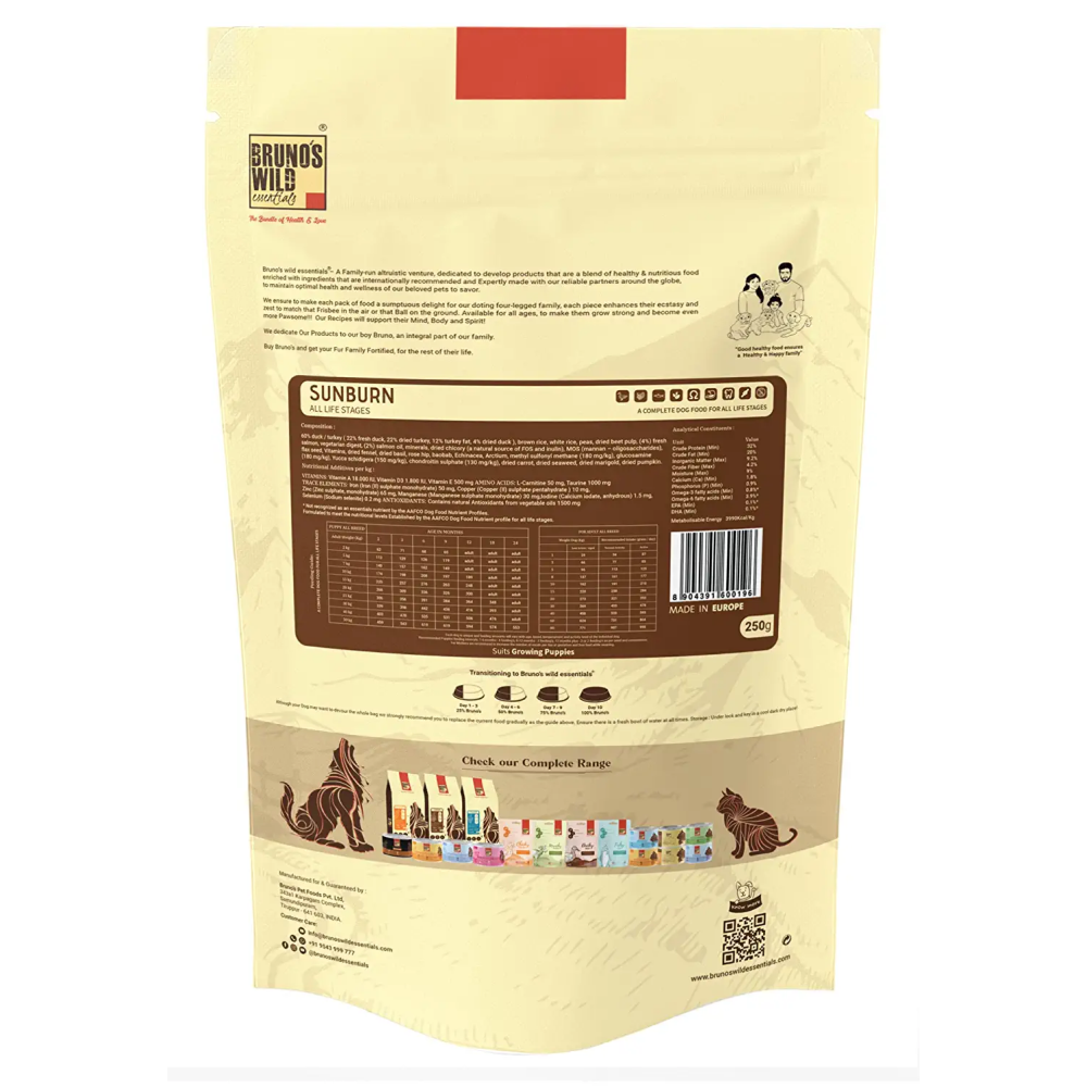 Bruno's Wild Essentials?ÿSunburn ƒ?? an enriched formula with more animal protein and herbs. Fresh Duck, especially for the iron- your dog needs to produce healthy red blood cells that contribute to organ and muscle health, lean protein from Turkey & fresh salmon, DHA for cognitive development, and balanced levels of Omegas help with the balanced nutrition for growth and well-being. Sunburn is a carefully crafted food - one with controlled levels of calcium for good bone development and a perfect balance. Every ingredient we include contributes to the balance of your dogƒ??s whole-body health. Suits for whelping, lactation mother & puppies also working/show dogs or any dogs require high energy.?ÿIngredients: Composition 60% Duck & Turkey (fresh duck 22%, dried turkey 22%, turkey fat 12%, dried duck 4%), brown rice, white rice, peas, dried beet pulp, fresh salmon (4%), vegetarian digest, salmon oil (2%), minerals, dried chicory (a natural source of FOS and inulin), MOS (mannan ƒ?? oligosaccharides), flax seed, Vitamins, dried fennel, dried basil, rose hip, baobab, Echinacea, Arctium, methyl sulfonyl methane (180 mg/kg), glucosamine (180 mg/kg), Yucca schidigera (150 mg/kg), chondroitin sulphate (130 mg/kg), dried carrot, dried seaweed, dried marigold, dried pumpkin.