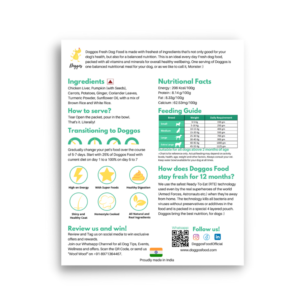 Doggos Mini Jumbo Monster is a pack of 30 meals of 150 grams each, its filled with freshest of ingredients that's not only good for your dog's health, but also for a balanced nutrition. This is an ideal every day Fresh dog food, packed with all vitamins and minerals for overall health of the dog. Good for all dogs above 3 months.
