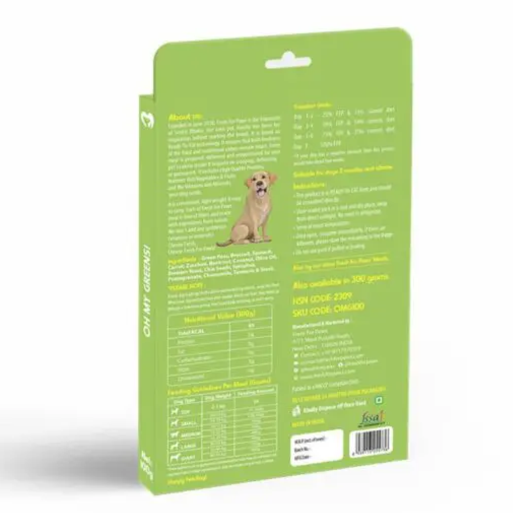 Greens in this recipes are Green Peas, Broccoli, Spinach, Zucchini and Spirulina combined with Carrots, Beetroot, Coconut, Pomegranate, Brewersƒ?? Yeast, Chia Seeds, Chamomile, Turmeric & Stock , made in Olive Oil to give our dogs a COMPLETE & BALANCED meal. Itƒ??s GRAIN- FREE & VEGAN. Our recipe is High in PLANT PROTEIN, FIBRE and has LOW FAT.