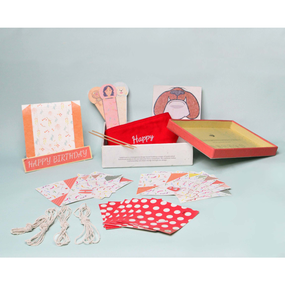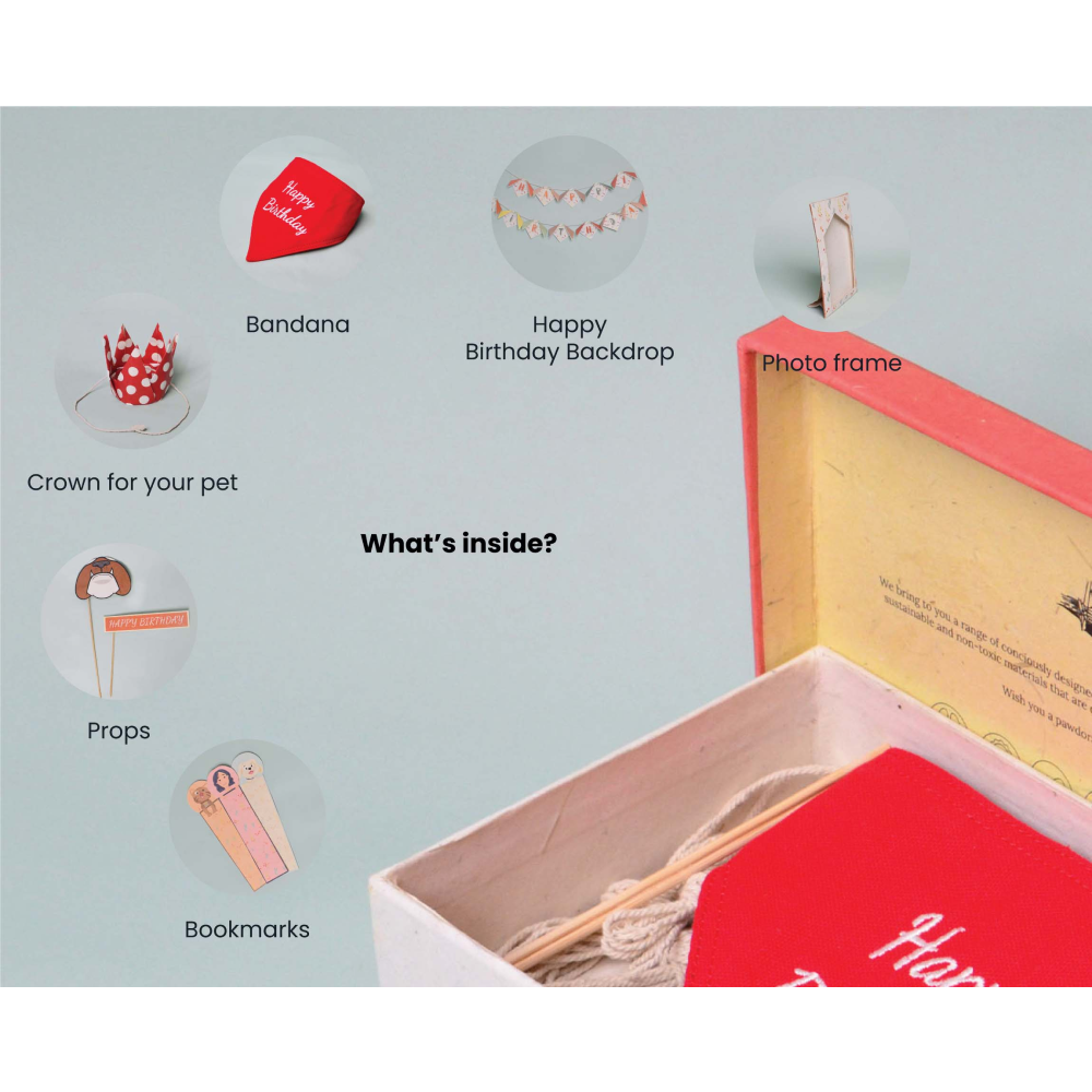This Birthday Box letƒ??s you enjoy the little things that you always wanted to do for your Pet. The curated Kit letƒ??s you celebrate your poochƒ??s birthday with all the glam! It has ƒ??do-it-yourselfƒ?? Props and a Crown for the Pet along with a Photo Frame to share your favorite picture. It also has Bookmarks, Birthday Banner decorations, and a red bandana for your Petƒ??s special day.