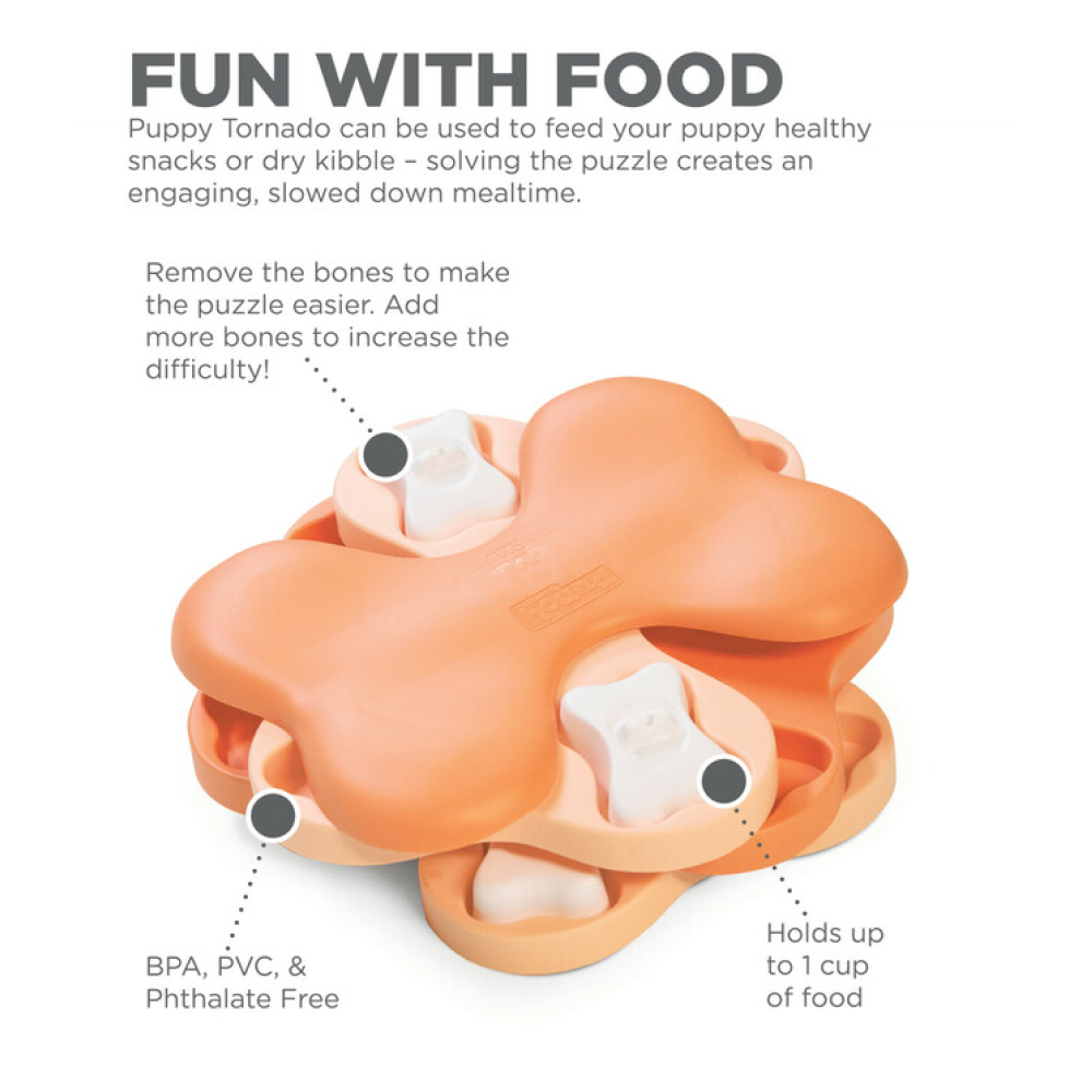 INTERMEDIATE DOG PUZZLE: Exercise your dogƒ??s mind with the interactive level 2 Dog Tornado puzzle toy. This engaging dog treat dispenser provides a fun physical & mental challenge. Your pup will need to learn how to combine multiple steps to retrieve the hidden treat.
