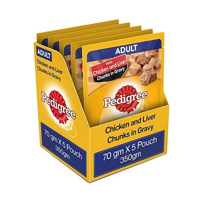 Chunks In Gravy- Pedigree Chicken & Liver wet food for puppies contains liver and chicken chunks that enhances the taste of the food and makes it palatable.