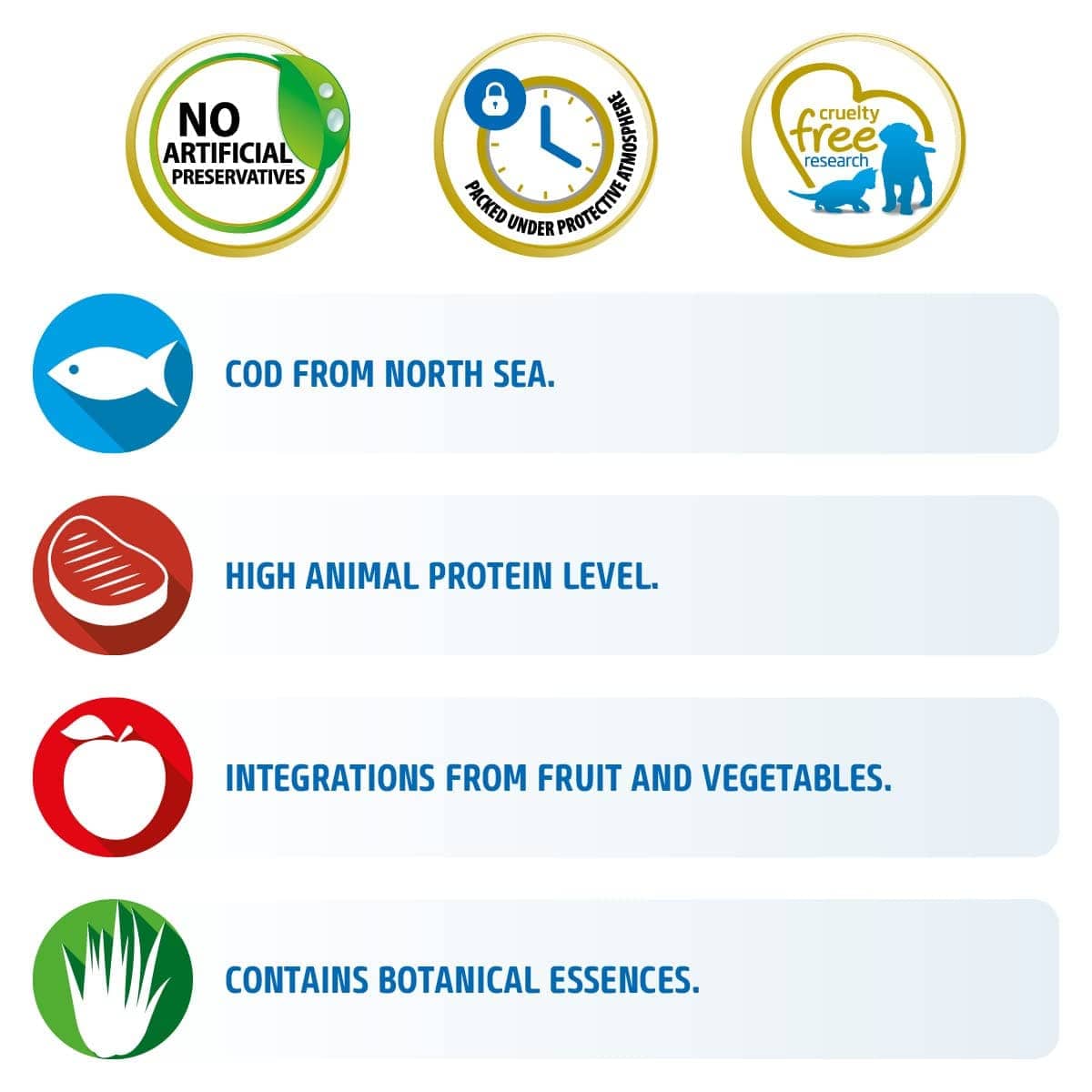 - 96% of protein from animal origin, 0% artificial preservatives, 0% grains