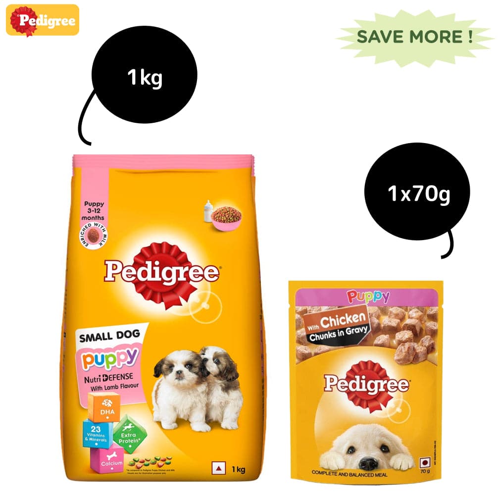 PEDIGREE complete and balanced dog food for puppies is a wholesome meal packed with essential nutrients vital to the healthy growth of your pet. PEDIGREE, with the goodness of cereals, chicken, meat, and the nutrients blend into a tasty and healthy treat for your little one.