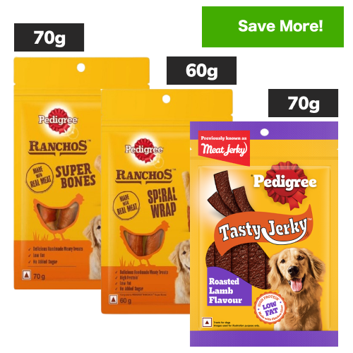 Pedigree Ranchos Super Bones Chicken & Milk, Spiral Wrap Chicken & Smokey Lamb and Roasted Lamb Tasty Jerky Dog Treats Combo
