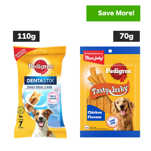 Pedigree Dentastix Oral Care for Adult (Small Breed of 5 to 10 kg) and Pedigree Chicken & Liver Flavour Tasty Jerky Dog Treats Combo