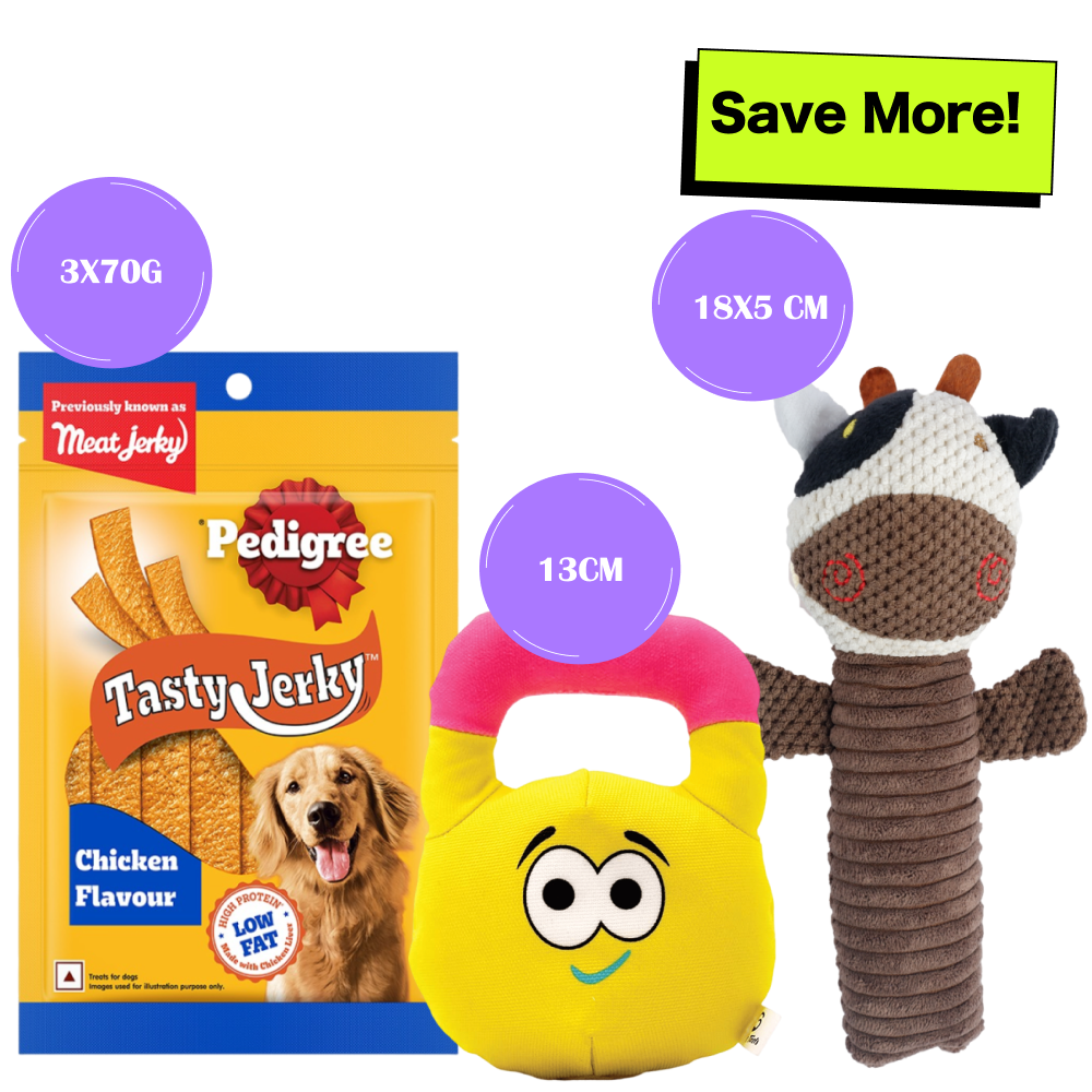 Pedigree Chicken & Liver Flavour Tasty Jerky Treat, Pet Vogue Cow Shaped Plush Toy and Goofy Tails Gym Series Kettlebell Plush Toy for Dogs Combo