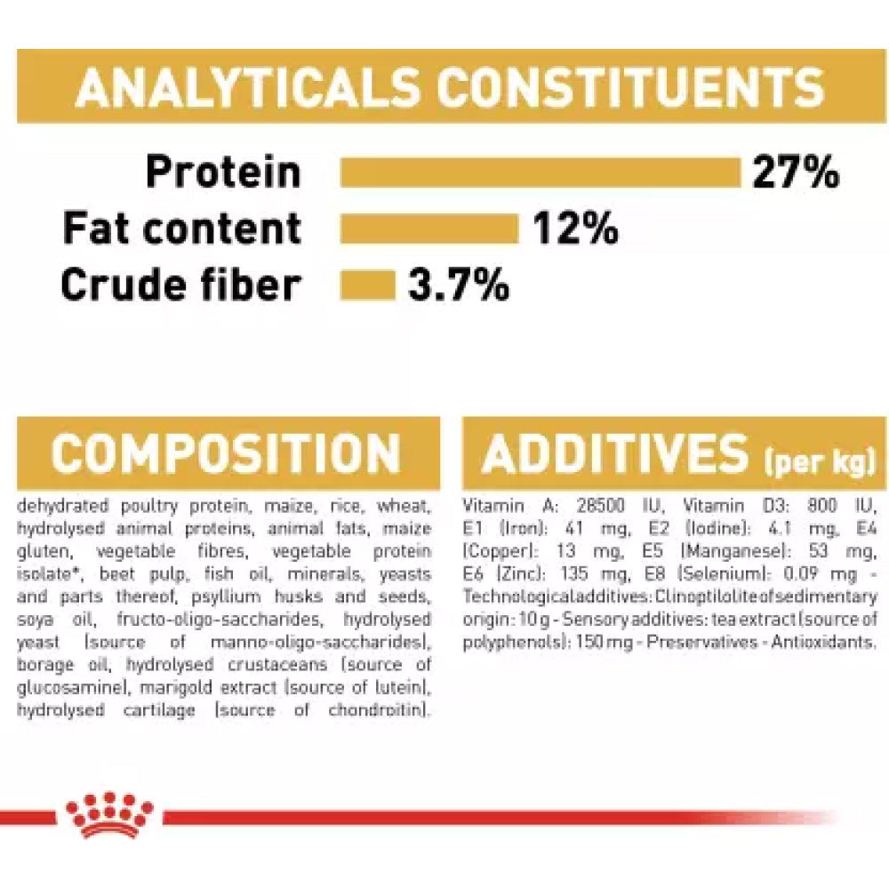 COMPOSITION: dehydrated poultry protein, maize, rice, wheat, hydrolysed animal proteins, animal fats, maize gluten, vegetable fibres, vegetable protein isolate*, beet pulp, fish oil, minerals, yeasts and parts thereof, psyllium husks and seeds, soya oil, fructo-oligo-saccharides, hydrolysed yeast (source of manno-oligo-saccharides), borage oil, hydrolysed crustaceans (source of glucosamine), marigold extract (source of lutein), hydrolysed cartilage (source of chondroitin). ADDITIVES (per kg): Nutritional additives: Vitamin A: 28500 IU, Vitamin D3: 800 IU, E1 (Iron): 41 mg, E2 (Iodine): 4.1 mg, E4 (Copper): 13 mg, E5 (Manganese): 53 mg, E6 (Zinc): 135 mg, E8 (Selenium): 0.09 mg - Technological additives: Clinoptilolite of sedimentary origin: 10 g - Sensory additives: tea extract (source of polyphenols): 150 mg - Preservatives - Antioxidants. ANALYTICAL CONSTITUANTS: Protein: 27.0% - Fat content: 12.0% - Crude ash: 6.2% - Crude fibres: 3.7% - Per kg: EPA/DHA: 3 g. * L.I.P.: protein selected for its very high digestibility. FOR RSA: Guaranteed analysis g/kg: Crude protein (min) 250 - Moisture (max) 110 - Crude fat (min) 100 - Crude fibre (max) 47 - Crude ash (max) 68. Product registration number: XXXXXX - Act 36/1947. For Namibia: N-FF XXXX.
