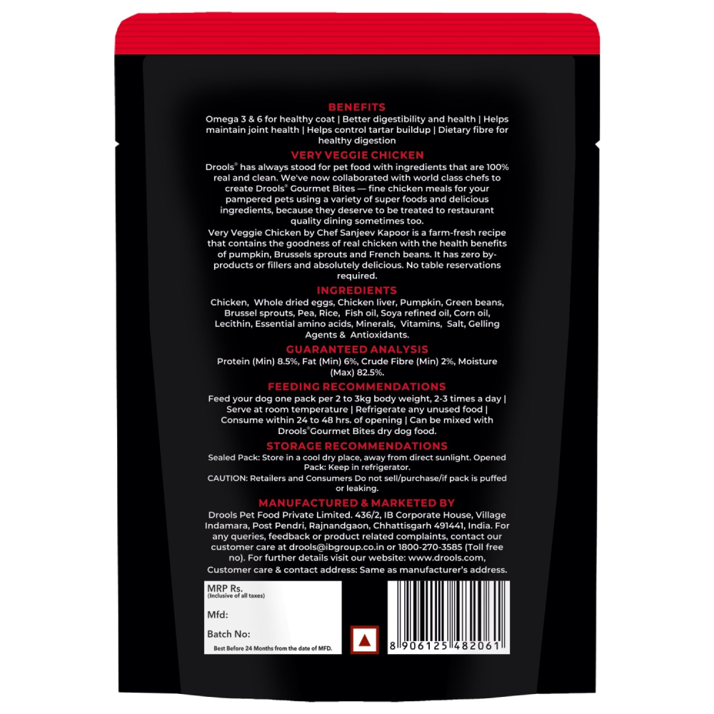 You will love that your dog relishes every chunk of the Drools Gourmet Bites Adult Gravy thoughtfully crafted by Sanjeev Kapoor. This farm-fresh recipe starts with Real Chicken mixed with a healthy blend of superfoods such as pumpkin, brussel sprouts, French beans and peas that are loaded with nutrient-dense ingredients to make this a delectable flavourful meal. This gravy can be mixed with dry kibble to add variety or served on its own. Formulated with a balanced proportion of Omega 3 & 6 fatty acids this recipe supports brain, eye and cognitive development, and enhances a shiny, healthy coat.