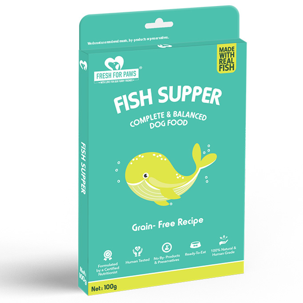Our Fish Supper is rich in LEAN PROTEIN and LOW in FAT & CALORIES which makes it an ideal choice. It is GRAIN -FREE. Packed with VITAMINS A, B6, B12, C, D, E & K and Minerals ƒ?? CALCIUM, MAGNESIUM, PHOSPHOROUS, IRON, POTASSIUM, ZINC, NIACIN and SELENIUM. It is high in BETA- CAROTENE and ANTIOXIDANTS. It is rich OMEGA ƒ?? 3 fatty acids. All these maintain the NERVOUS SYSTEM, SKIN & LUSTROUS COAT, VISION, IMMUNE SYSTEM, HEART, build STRONG BONES, CARTILAGE GROWTH, METABOLISM and PROPER BLOOD CLOTTING. It has ANTI- INFLAMMATORY properties that help prevent ILLNESSES, CELLULAR DAMAGE, and ANXIOUSNESS and eases ARTHRITIS PAIN. It is EASY TO DIGEST due to its FIBRE content. The meals is full of Fresh Fish (Tilapia), Pumpkin, Green Peas, Chickpeas, Green Beans, Carrot, Spinach, Zucchini, Basil, Rosehip & Stock made in Cod Liver Oil. The meal is COMPLETE & BALANCED.